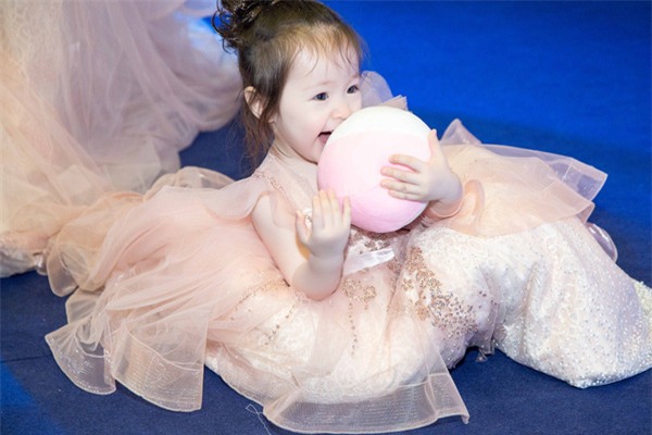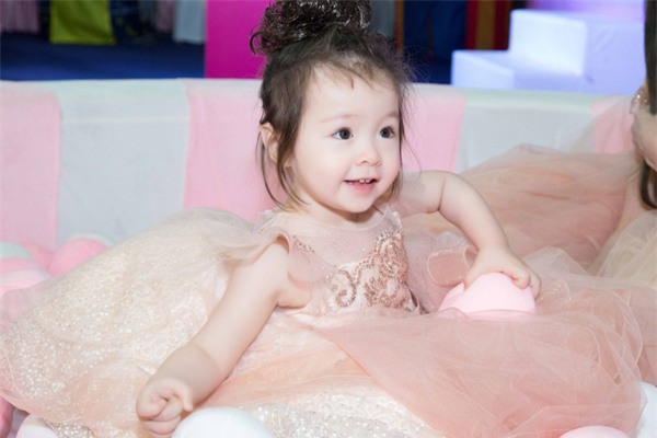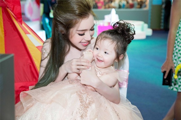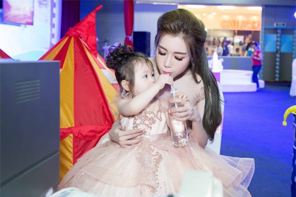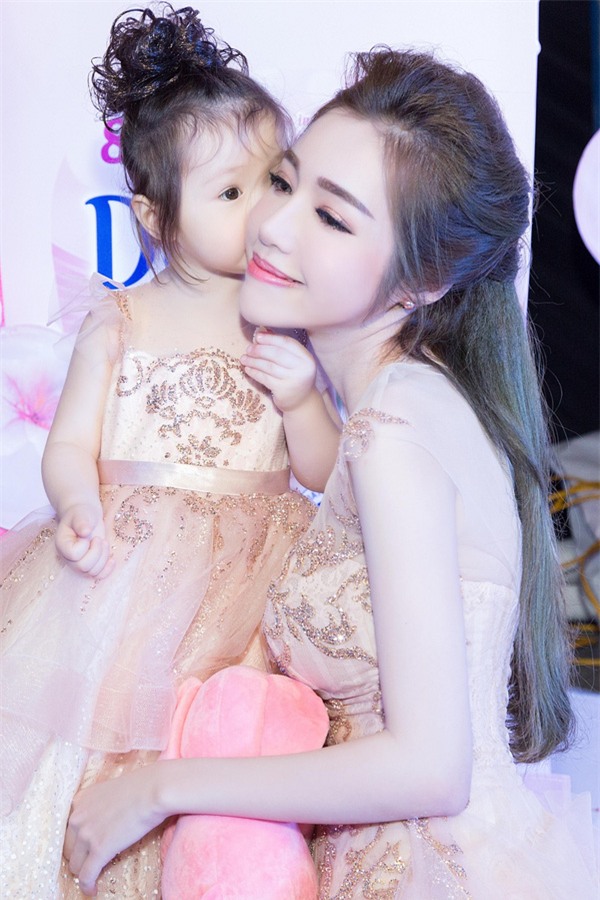 Mẹ con Elly Trần xuất hiện lộng lẫy trong bộ đầm dạ gam màu nude. Nữ diễn viên bới tóc cho con gái, tạo hình tượng cô công chúa nhỏ.