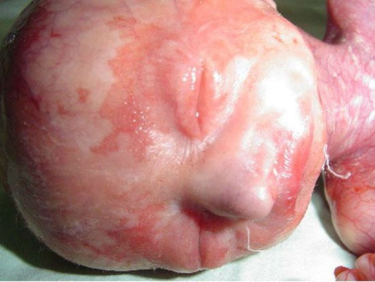 Một bà mẹ sinh ra bé sơ sinh không có da đã nhận thấy một số bất thường trong thai kỳ của mình. Sự phát triển của em bé khá chậm chạp trong thời kỳ mang thai của mẹ. Không giống như những đứa trẻ sơ sinh khỏe mạnh khác, hơn 90% cơ thể của bé này không được che phủ bởi da khi sinh. Ngoài ra, bé cũng không có móng tay, thậm chí không có lấy một sợi tóc, lông mi hay lông mày.