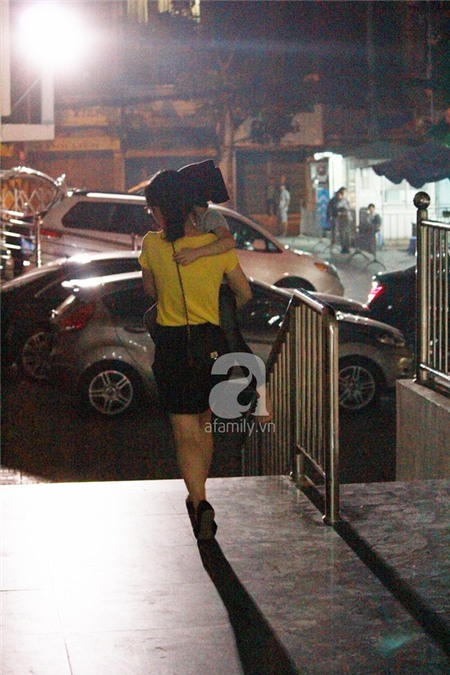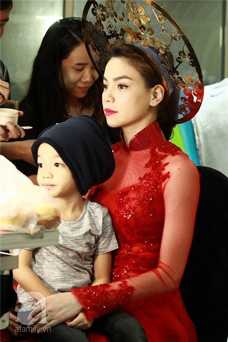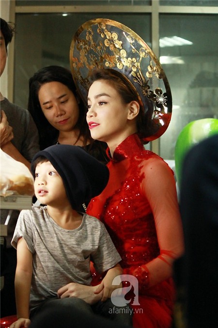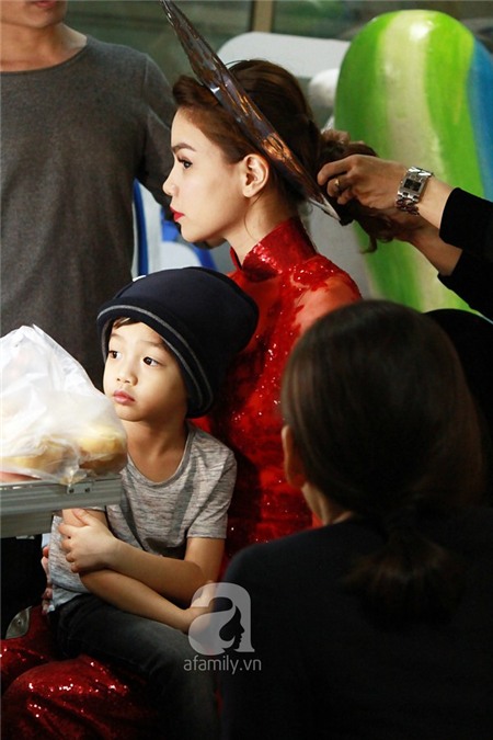 Nữ ca sĩ "Mối tình xưa" sau đó đã nhanh chóng vào trong thay 1 bộ trang phục khác, nhưng vẫn không rời con trai.