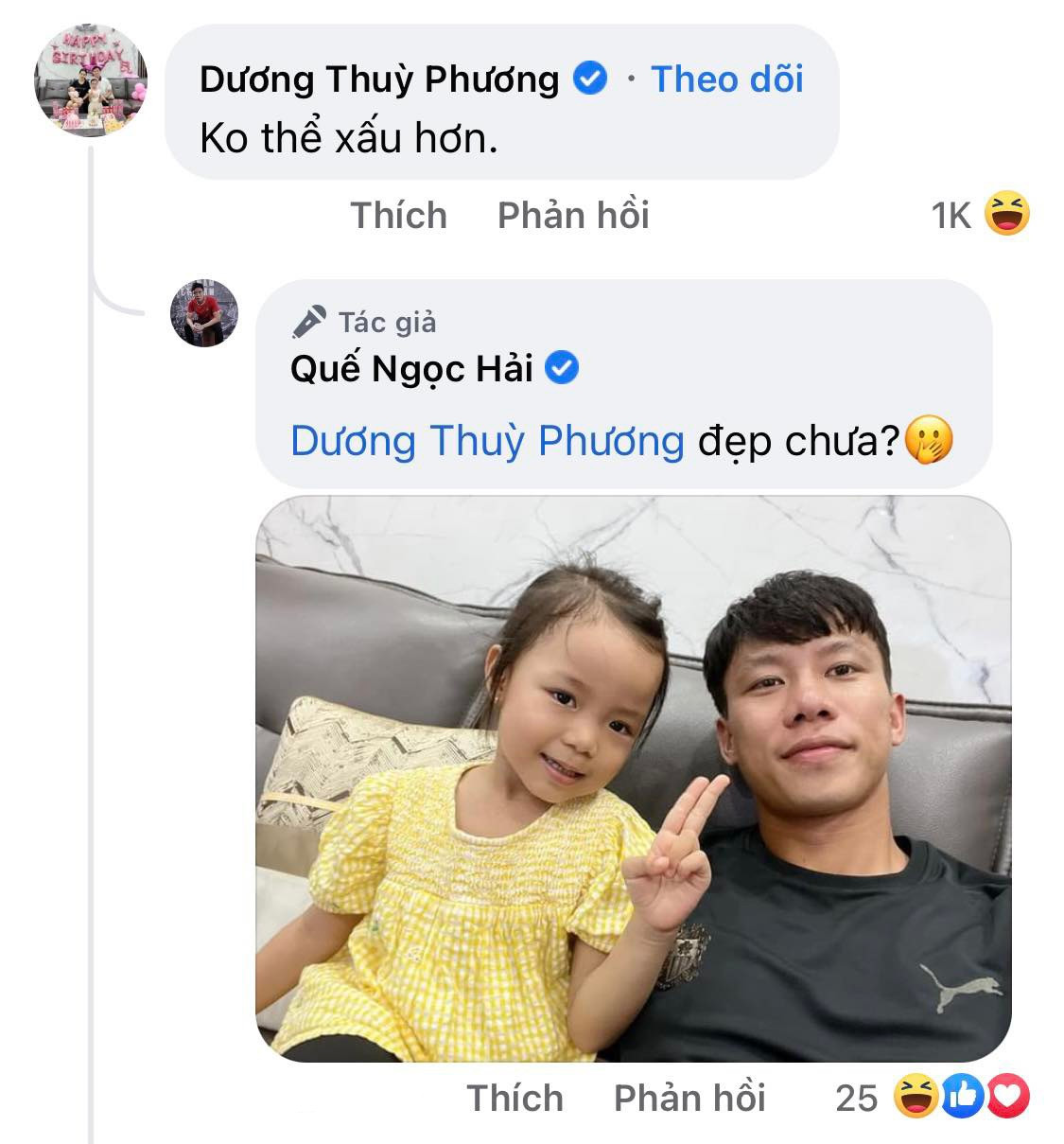 Mẹ bé Sunny cũng để lại bình luận tương tác dưới bức ảnh của hai bố con. Thế nhưng, thay vì dành lời khen, cô lại "chê" không thương tiếc: “Không thể xấu hơn”. Để phủ nhận lời nhận xét này, Quế Ngọc Hải liền đăng tải một hình ảnh khác bên con gái Sunny và hỏi bà xã: “Đẹp chưa?”.
