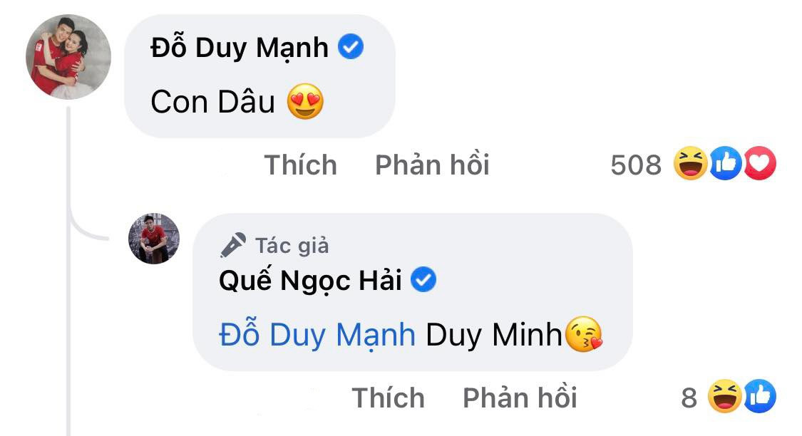 Trong khi cầu thủ Duy Mạnh nhanh chóng vào nhận “con dâu” thì Phan Văn Đức cũng dành lời khen “có cánh” cho hai bố con nhà Quế Ngọc Hải.