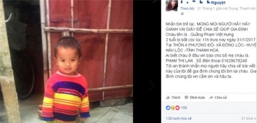 Cư dân mạng chia sẻ thông tin bé trai 2 tuổi bị mất tích vào đúng ngày Tết
