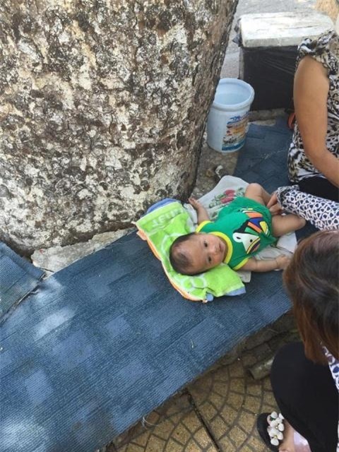 "Mẹ bé cứ đặt bé ở đây rồi đi suốt, nó nằm cạnh chỗ tôi bán trà đá. Thằng bé ngoan lắm, ai đi qua cũng cưng nựng. Nhiều người thấy em bé cười đáng yêu lắm, hớn hở, hóng cứ nhe răng cười, cứ nằm vạ vật 1 mình, mồ hôi mồ kê nên mua quà, sữa cho nó. Do ăn uống linh nên em bé bị chướng bụng, mấy cô mới cho đi khám, uống thuốc hôm qua", bà Dung chia sẻ về hoàn cảnh em bé này.