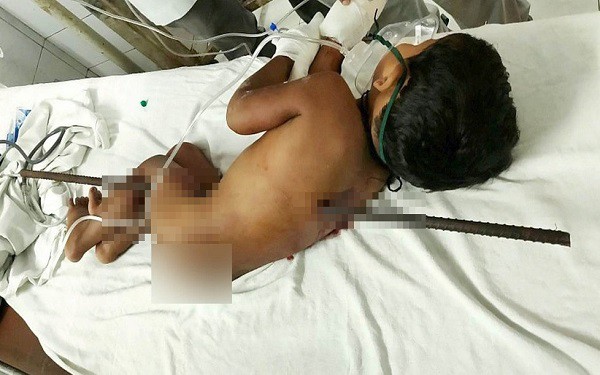 Theo The Sun, vào ngày 8/4 vừa qua, cậu bé Nadeem đang chơi cùng các bạn trên tầng 3 của một tòa nhà ở bang Uttar Pradesh, Ấn Độ thì bất ngờ bị ngã xuống dưới. Không ngờ bên dưới lại có một thanh sắt dài 1,8m dựng đứng ngay vị trí cậu bé rơi, cả thanh sắt dài xuyên qua đùi trái rồi qua bụng dưới và lưng của bé trai 3 tuổi. May mắn là nó không xuyên thủng bất kỳ cơ quan nội tạng quan trọng nào trong bụng cậu bé. Nadeem nằm trong tư thế cuộn tròn người lại như một thai nhi sau khi bị thanh sắt xuyên qua.