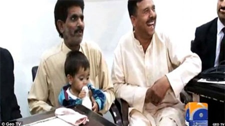 Em bé 9 tháng tuổi ngồi trong lòng cha trong phiên tòa hôm 3/4. Ảnh: Geo TV.