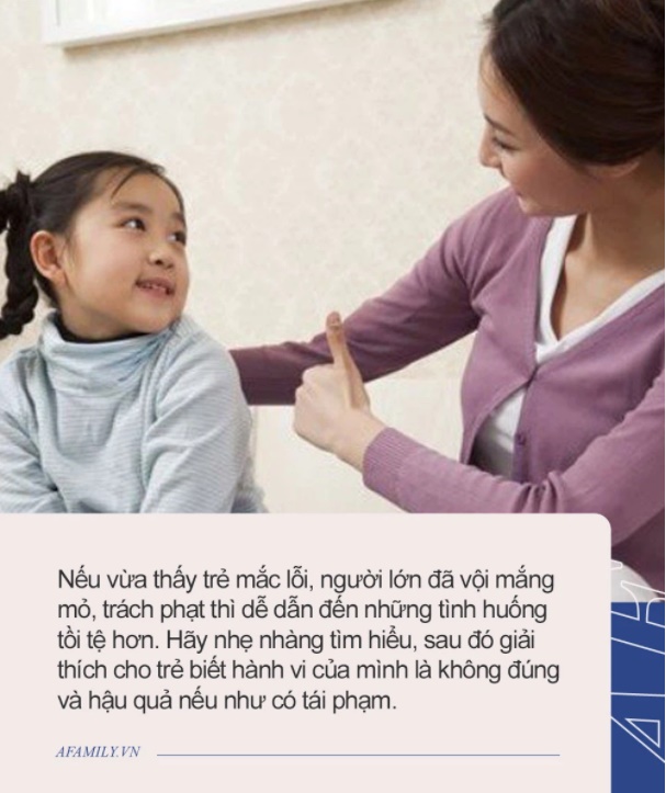 Nếu vừa thấy trẻ mắc lỗi, người lớn đã vội mắng mỏ, trách phạt thì dễ dẫn đến những tình huống tồi tệ hơn. Hãy nhẹ nhàng tìm hiểu, sau đó giải thích cho trẻ biết hành vi của mình là không đúng và hậu quả nếu như có tái phạm. Bằng cách này, trẻ vừa bỏ được thói quen xấu, lại học được thêm nhiều điều.