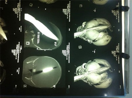 Kết quả chụp CT cho thấy bé bị dao đâm từ hốc mắt trái xuyên qua não phải, thấu ra tận phía sau, dao bầu cắm sâu tới 11cm vào trán.
