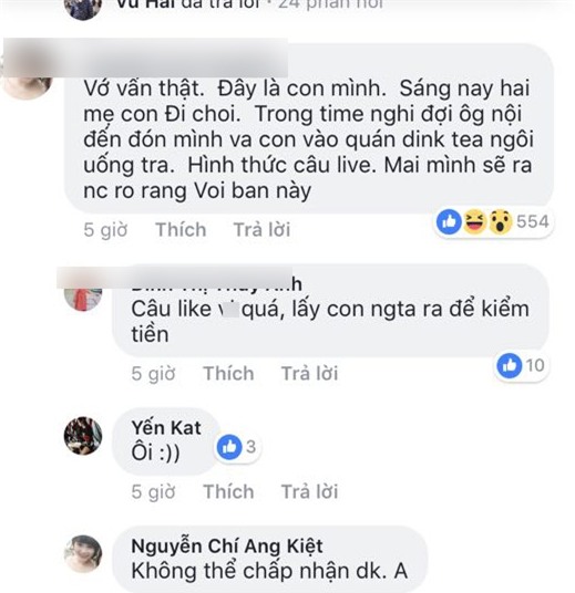 Tuy nhiên, ngay trong buổi tối, một thành viên tham gia diễn đàn đã xuất hiện tự nhận mình chính là mẹ của bé trai nói trên. Người này nói: "Vớ vẩn thật. Đây là con mình. Sáng nay hai mẹ con đi chơi. Trong lúc nghỉ đợi ông nội đến đón mình và con vào quán xx ngồi uống trà. Hình thức câu like. Mai mình sẽ nói chuyện rõ ràng với bạn này".