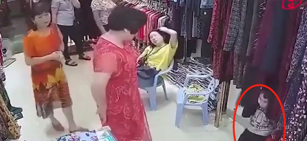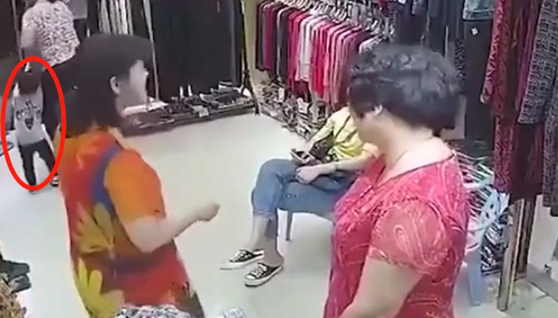 Bé trai bị người phụ nữ trung niên dắt đi dù trong cửa hàng có nhiều người
