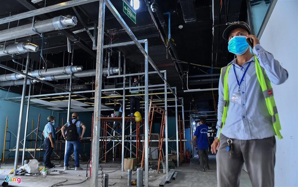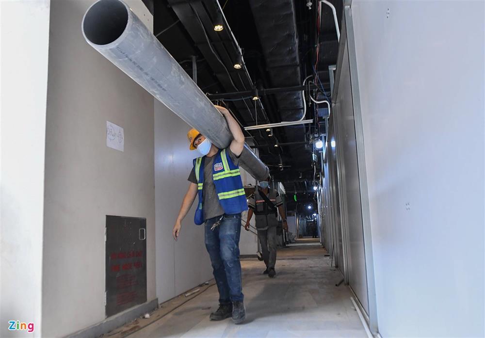 Qua một nửa thời gian, đơn vị thi công cơ bản hoàn thành viện tháo dỡ kiến trúc cũ và thiết lập các vách ngăn mới theo cấu hình của bệnh viện dã chiến. Trong ngày 14/7, phóng viên ghi nhận công nhân đang lắp hệ thống điện, lắp quạt, đèn, các đường ống dẫn.