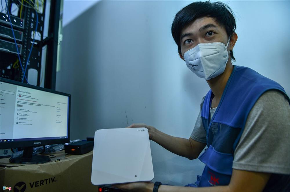 Nhân viên kỹ thuật lắp đặt Wi-Fi và camera giám sát bên trong bệnh viện dã chiến.