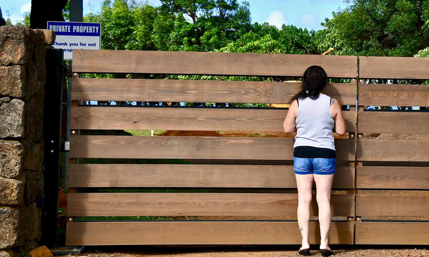 “Tài sản riêng tư, cảm ơn đã không xâm phạm”, một tấm bảng được đặt trên cửa tòa nhà. Bức tường, được xây từ đá núi lửa, là thứ khiến cho nhiều người dân sống tại hòn đảo này nổi giận. Bức tường kéo dài cả dặm từ bờ biển, khiến cho nhiều người không thể nhìn thấy bãi biển khi đi trên đường.