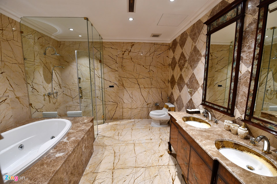 Toàn bộ nhà vệ sinh cũng được làm rộng rãi, có nội thất sang trọng. Từ đá ốp đá, thiết bị vệ sinh đều được nhập khẩu từ những hãng danh tiếng trên thế giới.