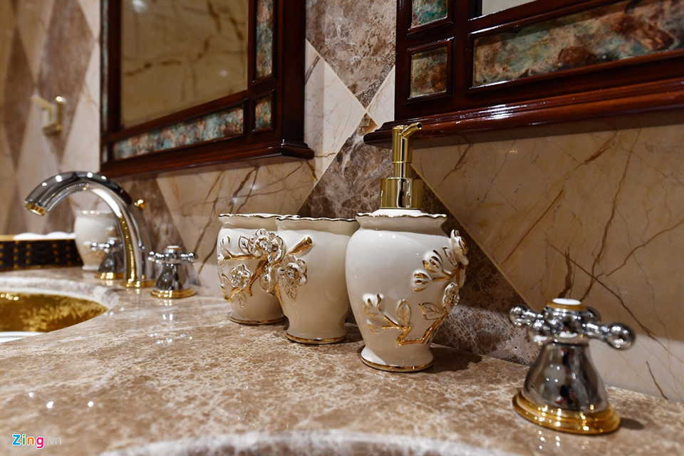 Những chi tiết như bồn rửa mặt, bồn cầu, vòi nước... được mạ vàng từ 14-24K. Với tông màu chủ đạo là sáng, kết hợp mạ vàng, nhà vệ sinh như rộng rãi, sạch sẽ và sang trọng hơn.