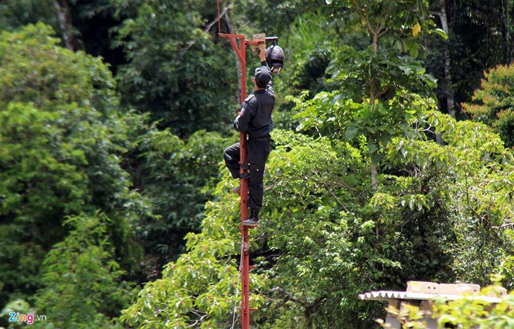 Cảnh sát gỡ camera trên nóc nhà Nguyễn Thanh Tuân. Lực lượng chức năng cho biết ông trùm 35 tuổi gắn camera quanh nhà và cả phía sau bìa rừng.