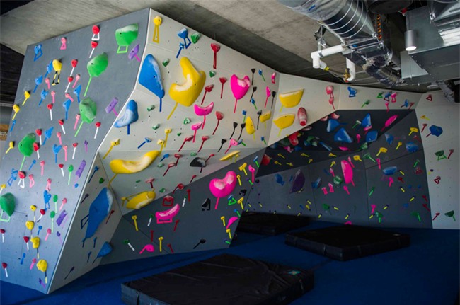 Tường leo núi trong nhà ở tòa nhà đầu tiên. Bức tường này được thay đổi sau vài tháng để không gây nhàm chán.