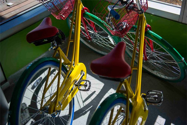 Hai chiếc xe đạp Google. Google cung cấp xe đạp miễn phí cho nhân viên đi vòng quanh thành phố và các trạm sạc cho ô tô điện tại bãi đỗ xe. Ngoài ra, ở đây còn có phòng sửa xe đạp.