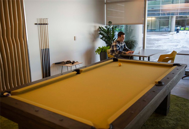Một nhân viên làm việc cạnh bàn bi-a. Các không gian linh động trong tòa nhà giúp nhân viên không phải gắn chặt vào bàn làm việc cả ngày.