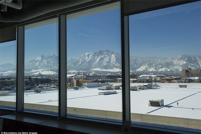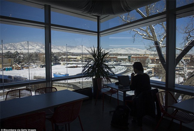 Nhân viên làm việc gần cửa sổ nhìn radãy núi Flatirons. Google đã hoàn thành 2 trong 3 tòa nhà của cơ sở mới ở Boulder.