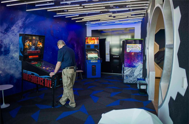 Một nhân viên chơi máy đánh bi trong khu giải trí của tòa nhà. Năm 2014, Google thông báo sẽ xây dựng khuôn viên gồm 3 tòa nhà có thể chứa 1.500 nhân viên.