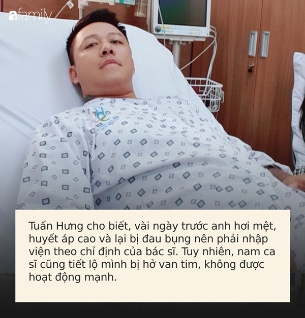 Tuấn Hưng cho biết, vài ngày trước anh hơi mệt, huyết áp cao và lại bị đau bụng nên phải nhập viện theo chỉ định của bác sĩ. Tuy nhiên, nam ca sĩ cũng tiết lộ mình bị hở van tim, không được hoạt động mạnh.