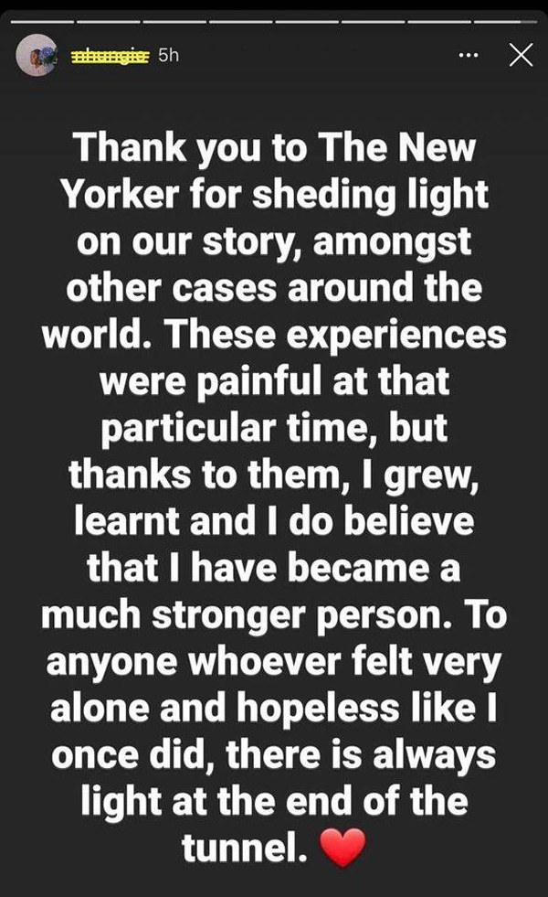 Sau bài báo đó, trên Instagram, bệnh nhân 17 tên N.H.N viết: "Cám ơn The New Yorker đã làm sáng tỏ câu chuyện của chúng tôi giữa rất nhiều trường hợp khác trên thế giới. Những trải nghiệm lúc đó thật sự rất đau lòng, nhưng nhờ nó mà tôi trưởng thành, đã học được và tin rằng mình đã trở thành một người mạnh mẽ hơn. Gửi tới những ai đã từng cảm thấy cô đơn và tuyệt vọng như tôi lúc đó rằng: Sẽ luôn có ánh sáng ở phía cuối con đường". Dòng trạng thái này đã được chuyển sang chế độ riêng tư.