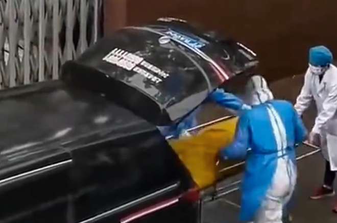 Đoạn video lan truyền trên mạng xã hội Trung Quốc cho thấy nhân viên nhà xác di chuyển một túi đựng thi hài bên ngoài bệnh viện Tân Trường Chinh ở quận Phổ Đà, Thượng Hải, vào chiều 1/5, theo South China Morning Post.