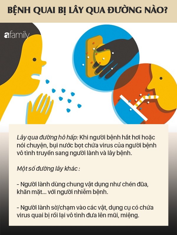 Bệnh quai bị có thể lây truyền dễ dàng qua đường hô hấp: Khi người bệnh hắt hơi hoặc nói chuyện, bụi nước bọt chứa virus trong hơi thở người bệnh vô tình truyền sang người lành thì sẽ làm lây bệnh. Sau khi xâm nhập vào cơ thể, virus quai bị bám vào niêm mạc mũi, miệng, sau đó di chuyển đến nội tạng qua đường máu và gây bệnh. Thời gian dễ lây nhiễm nhất là vài ngày trước khi các triệu chứng phát triển và trong vài ngày sau đó.