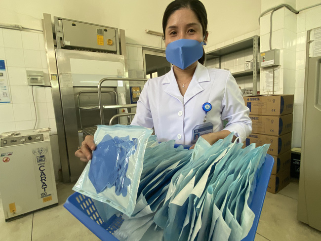 Để làm ra chiếc khẩu trang không dệt, sau khi rập khuôn tạo hình phải ép nhiệt cho dính các lớp khẩu trang rồi đưa chúng đến khoa Kiểm soát nhiễm khuẩn thực hiện khử trùng, hấp sấy và chuyển thành phẩm cho các nhân viên y tế sử dụng.