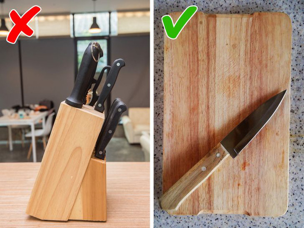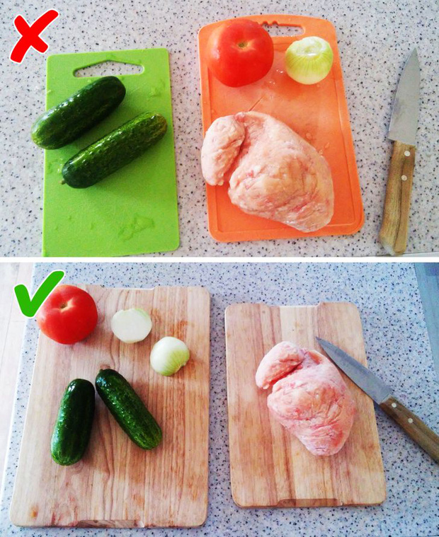 Những chiếc thớt nhựa với màu sắc loè loẹt có thể làm căn bếp sang trọng của bạn trở nên kém sang. Bên cạnh đó, các chuyên gia khuyến cáo bạn không nên sử dụng thớt nhựa bởi theo thời gian, các vết xước và vân trên thớt càng sâu càng khó làm sạch đúng cách hơn. Bạn cũng nên sử dụng thớt riêng cho thịt, rau, cá và thực phẩm ăn liền để tránh vi khuẩn từ đồ sống bám sang đồ ăn.