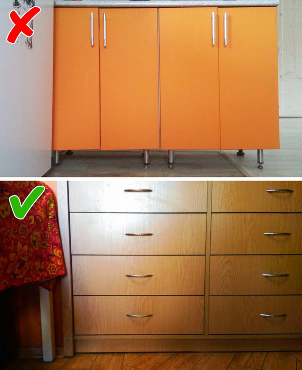 Bụi, lông vật nuôi và nhiều thứ khác sẽ chất thành đống trong khoảng trống dưới tủ bếp và sàn bếp. Bạn sẽ phải rất vất vả để dọn dẹp sạch sẽ đống hỗn độn khỏi những nơi khó tiếp cận như thế. Vì thế thay vì đồ nội thất hoặc tủ bếp có chân bạn nên chọn tủ bếp đặt sát sàn, sẽ dễ dàng hơn cho việc làm sạch.