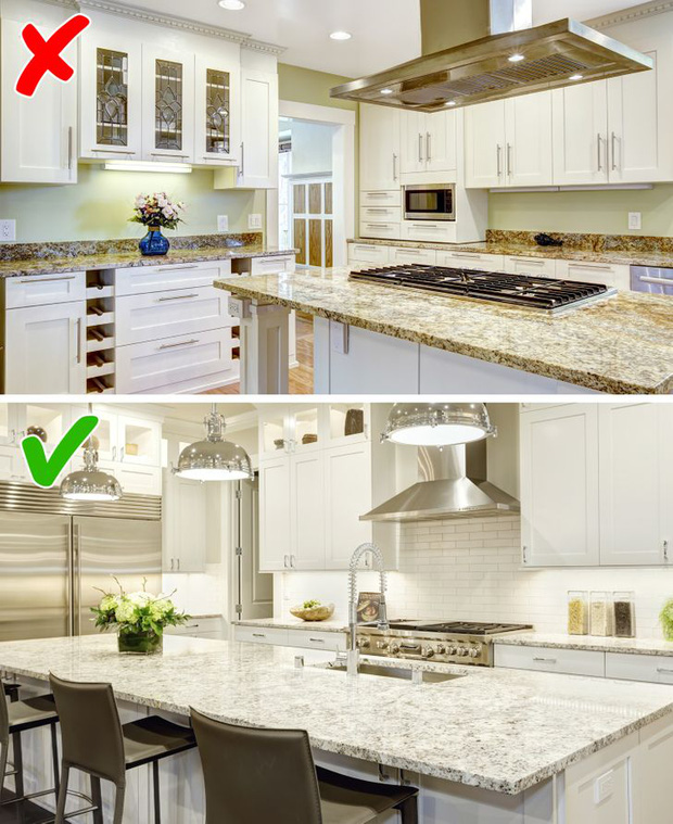 Ngay cả khi kích thước nhà bếp của bạn cho phép, bạn cũng không nên đặt bếp nấu trên đảo bếp. Bởi bạn sẽ phải dọn dẹp cả đảo bếp sau khi nấu nướng thay vì chỉ cần lau bếp và tường nếu bếp được đặt cạnh tường bếp. Tốt hơn hết là bạn chỉ nên đặt một bồn rửa ở khu vực đảo bếp nếu không muốn nhiệt làm xuống cấp nhanh chóng bề mặt của đảo bếp.