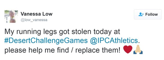 VĐV khuyết tật người Đức Vanessa Low mới đây đã gặp một sự cố nghiêm trọng tại giải điền kinh IPC Grand Prix ở Arizona, Mỹ. Theo đó, đôi chân giả của VĐV điền kinh 25 tuổi đã bị một kẻ lạ mặt đánh cắp. Trên trang Twitter cá nhân, Vanessa Low viết: "Đôi chân giả của tôi đã bị đánh cắp. Xin hãy giúp tôi tìm/ thay thế nó".
