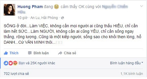 Giành chiến thắng ở tập 5 The Face, nhưng đội Phạm Hương không nhận được đánh giá cao của các thí sinh trong đội Lan Khuê và Hồ Ngọc Hà. Số đông đều cho rằng, kết quả không công bằng và đội Lan Khuê xứng đáng hơn. Không những vậy, có rất nhiều người hâm mộ đã thẳng thắn chia sẻ quan điểm của mình về kết quả không mấy hài lòng này. Đứng trước những 'chỉ trích' về kết quả, Phạm Hương đã bày tỏ suy nghĩ của mình trên trang cá nhân. Cô viết: "Sống ở đời... làm việc, không cần mọi người ai cũng thấu hiểu, chỉ cần làm hết sức... Làm người, không cần ai cũng yêu, chỉ cần sống ngay thẳng, rộng lượng... Cũng là một kiếp người, sống sao cho khỏi thẹn lòng, hổ danh... cứ văn minh thôi".