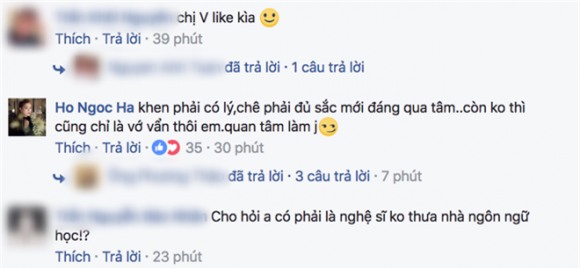 Sự việc càng trở nên ồn ào và gây chú ý hơn khi Hồ Ngọc Hà đã để lại một dòng comment cứng rắn bày tỏ quan điểm của cô: "Khen phải có lý, chê phải đủ sắc mới đáng qua tâm. Còn không thì cũng chỉ là vớ vẩn thôi em, quan tâm làm gì?".