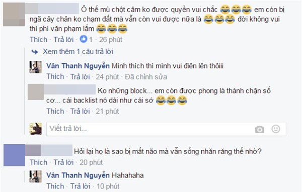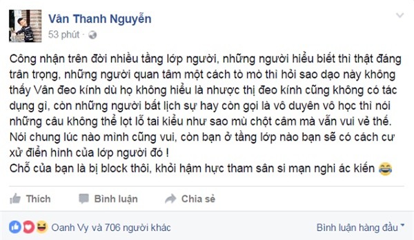 Qua status, có thể thấy Vân Hugo khá bức xúc khi lối sống lạc quan vui vẻ của mình bị chỉ trích. Cô cũng cho biết đã thẳng tay "block" người đã cư xử phũ phàng với mình.