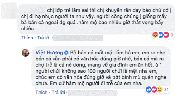 Không thèm im lặng cho qua, Việt Hương đã đáp trả rằng: "Bán cá mất mặt lắm hả em, em ra chợ bán cá vẫn phải có văn hóa đúng giờ nhé, bán cá mà ra chợ trễ là cá nó ươn, mang về gia đình em ăn hết, à 1 người chửi không sao 100 người chửi là mệt nha em. Chúc em có văn hóa đúng giờ và bớt bênh mù quáng nghe chưa. Em cứ hâm mộ người đi trễ của em nha".