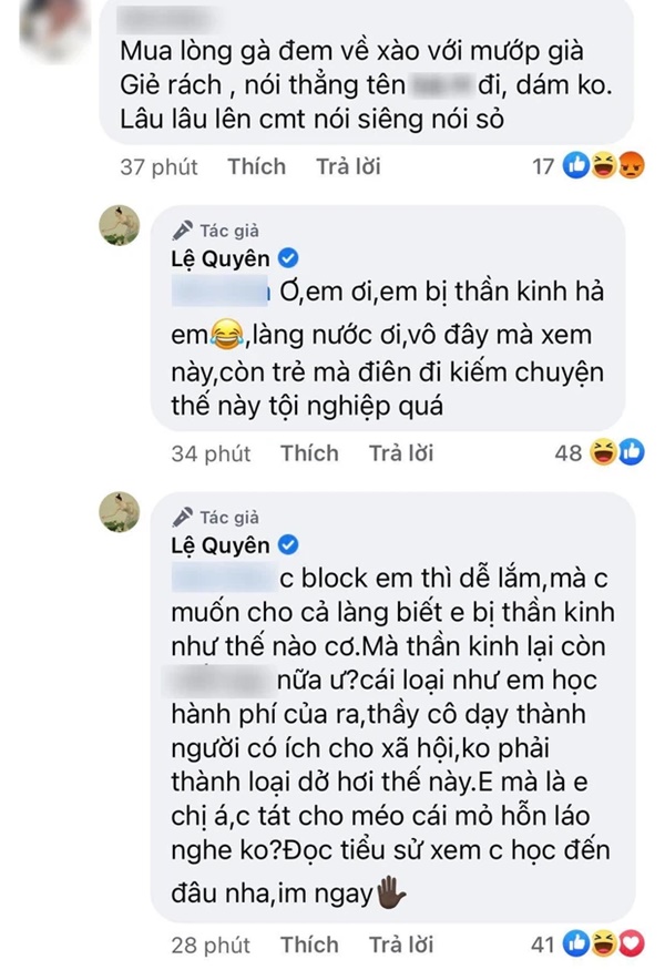 Đáng nói nhất, 1 người còn dùng từ ngữ vô cùng thậm tệ để mắng Lệ Quyên và cho rằng "Nữ hoàng phòng trà" đang "cà khịa" ai đó. Dường như không thể tiếp tục chịu đựng được những bình luận tiêu cực, nữ ca sĩ đã đáp trả ngay lập tức: "Em bị thần kinh hả em?... Còn trẻ mà điên, đi kiếm chuyện thế này tội nghiệp quá. Chị chặn em thì dễ lắm, mà chị muốn cho cả làng biết em bị thần kinh như thế nào cơ. Mà thần kinh lại còn *** *** nữa ư? Cái loại như em học hành phí của ra, thầy cô dạy thành người có ích cho xã hội, không phải thành loại dở hơi thế này. Em mà là em chị á, chị tát cho méo cái mỏ hỗn láo nghe không? Đọc tiểu sử xem chị học đến đâu nha, im ngay!".