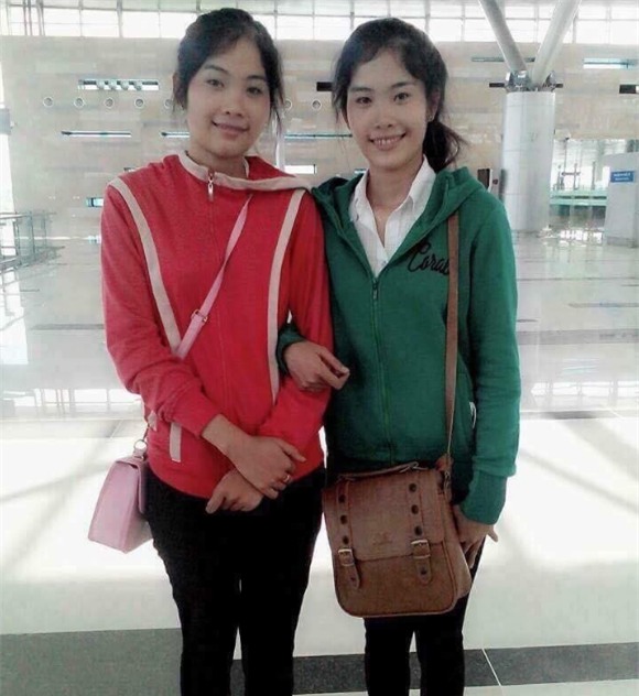 Nam Em (bên trái) và người chị sinh đôi Lệ Nam thời còn đi học. Có thể thấy gương mặt thời bấy giờ của Nam Em khá mờ nhạt với đôi mắt bé, sống mũi hơi tẹt và gương mặt ngắn.