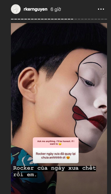 Mới đây, Rocker Nguyễn đã xuất hiện trở lại. Anh chàng trông mập mạp hơn, tóc cũng dài ra hẳn. Nam diễn viên, ca sĩ này khá chăm chỉ livestream tương tác cùng khán giả. Nhiều cư dân mạng đã thông qua một tính năng mới của Instagram đang rất được yêu thích để gửi các câu hỏi ở nhiều chủ đề khác nhau đến Rocker Nguyễn.