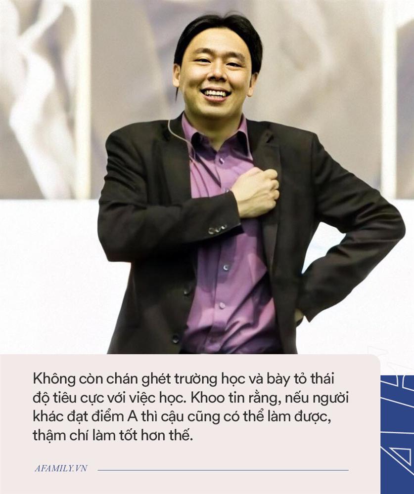 Quan điểm này đã truyền cảm hứng học tập cho Adam Khoo. Không còn chán ghét trường học và bày tỏ thái độ tiêu cực với việc học. Khoo tin rằng, nếu người khác đạt điểm A thì cậu cũng có thể làm được, thậm chí làm tốt hơn thế.