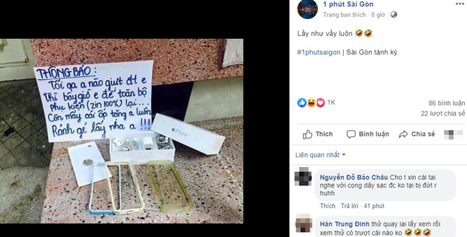 "Thông báo. Tối qua anh nào giựt điện thoại của em thì bây giờ em để lại toàn bộ phụ kiện (zin 100%) lại... Còn mấy cái ốp tặng anh luôn. Rảnh ghé lấy nha anh!".