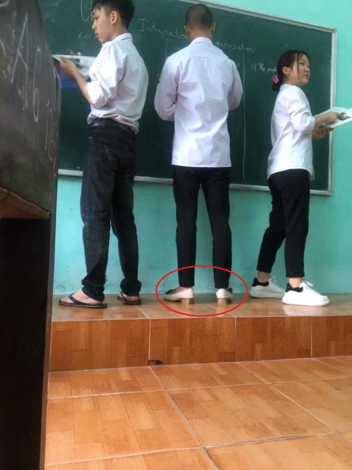 Cứ tưởng bạn nữ bên phải không sơ vin, bạn nam bên trái đi tông là vi phạm nội quy, nhưng hóa ra người chiếm "spotlight" nhất lại là bạn nam sinh ở giữa… nhờ đôi giày. Nếu đây là đôi giày thể thao thì không ai nói làm gì, đằng này đây hẳn hoi là một đôi giày nữ, cao khoảng 3cm, màu hồng phấn và có gắn nơ ở phía trên.