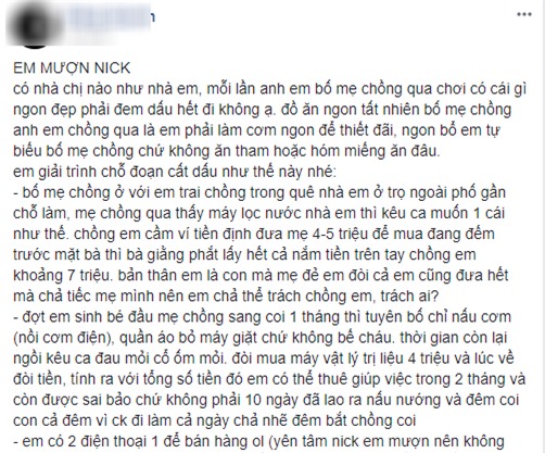 Đầu tiên, nàng dâu nhà ta than thở về mẹ chồng như sau: "Bố mẹ chồng ở với em trai chồng dưới quê, nhà em ở trọ ngoài phố gần chỗ làm, mẹ chồng qua thấy máy lọc nước nhà em thì kêu ca muốn 1 cái như thế. Chồng em cầm ví tiền định đưa mẹ 4 - 5 triệu để mua, đang đếm trước mặt bà thì bà giằng phắt lấy hết cả nắm tiền trên tay chồng em khoảng 7 triệu.