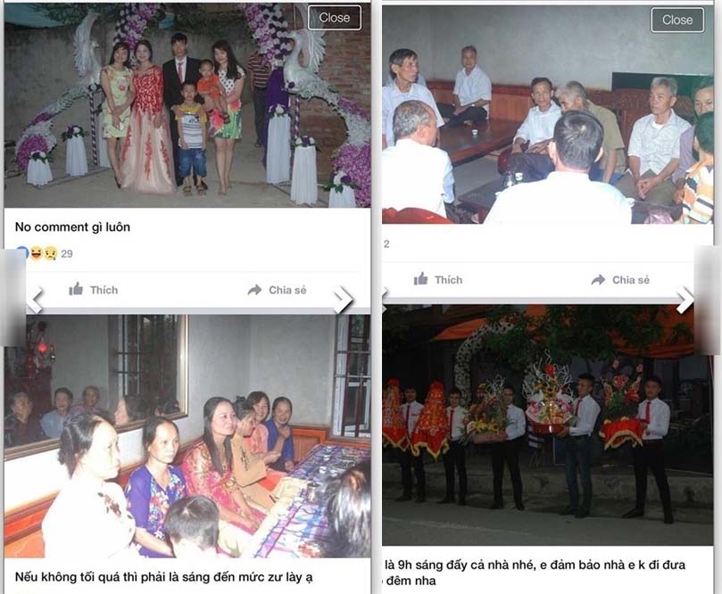 Bộ ảnh kèm lời chia sẻ khá dài: “Trăm năm mới có một ngày hạnh phúc, ai mà không mong ghi lại những khoảnh khắc đẹp để đời, nên nhà mình thuê một nhiếp ảnh với chi phí 500.000 đồng/2 buổi (1 tiếng lúc ăn hỏi, 2 tiếng hôm cưới). Và đúng là đã ra được những sản phẩm 'để đời' thật sự, mình đăng ở dưới để các bạn xem…”.