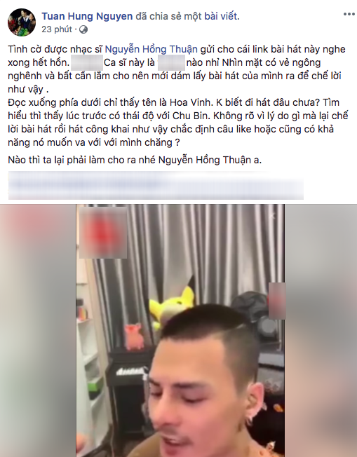 Dòng trạng thái đầy bức xúc của Tuấn Hưng khi thấy Hoa Vinh cover bản hit của mình bằng những từ ngữ nhạy cảm.