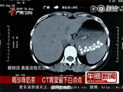 Phóng viên này sau khi uống trà sữa trân châu một thời gian ngắn đã làm CT (chụp cắt lớp) và thu được kết quả, có 20 viên nhỏ màu trắng đọng tại trong dạ dày. Bác sĩ chụp CT cho người này cho hay, nếu dùng bột làm trân châu thì những viên trân châu này sẽ dễ dàng được tiêu hóa.