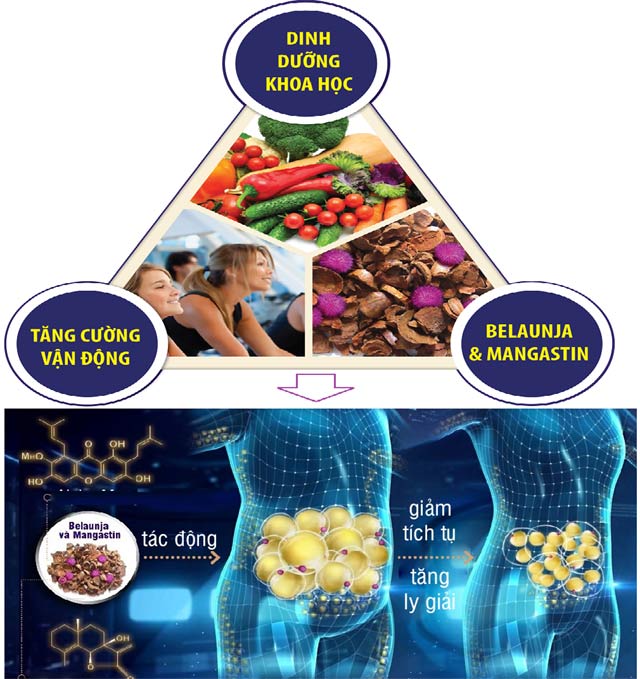 Sản phẩm hỗ trợ chứa tinh chất tác động từ gốc tế bào mỡ trắng: Gần đây, bằng công nghệ sinh học phân tử, các nhà khoa học Mỹ đã chứng minh tinh chất thiên nhiên Belaunja & Mangastin giúp giảm tích tụ và tăng ly giải mỡ trắng hiệu quả.