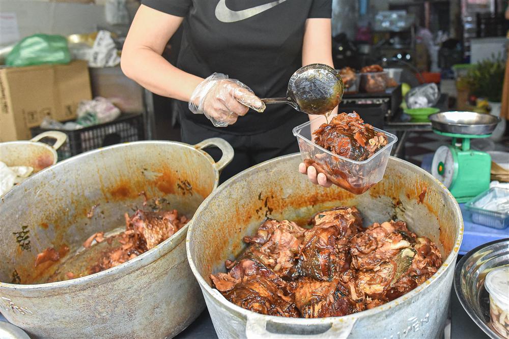 "Bếp nhà mình đỏ lửa 24/24h, cứ nồi này hạ xuống lại nồi khác bắc lên", chị Huyền vừa thoăn thoắt đóng cá kho cho khách hàng vừa chia sẻ. Chị Phạm Thị Huyền mở cửa hàng tại ngõ Cầu Gỗ, Hà Nội được 5 năm. Mặt tiền bán hàng chỉ để vừa một chiếc bàn, trên đó bày đủ các món ăn theo hương vị miền Bắc như: cá trắm kho, cá nục kho, tôm rim thịt, sườn chua ngọt,... Nhưng món ăn "chạy hàng" nhất, làm nên "thương hiệu" của quán chị Huyền chính là cá trắm kho.