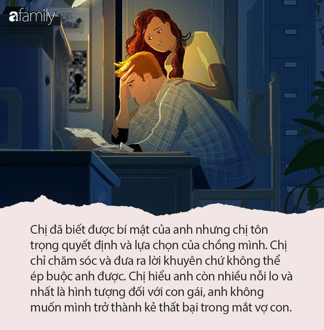 Chị đã biết được bí mật của anh nhưng chị tôn trọng quyết định và lựa chọn của chồng mình. Chị chỉ chăm sóc và đưa ra lời khuyên chứ không thể ép buộc anh được. Chị hiểu anh còn nhiều nỗi lo và nhất là hình tượng đối với con gái, anh không muốn mình trở thành kẻ thất bại trong mắt vợ con. Sự tinh tế này của chị thật sự quá xứng đáng với nỗ lực của anh thời gian qua.